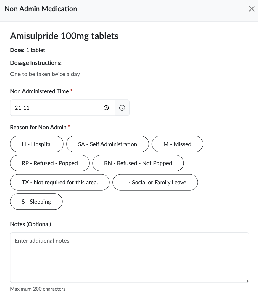 If you are unable to administer the medication, you must record the reason. It's also important that you've set up all the suitable non-admin codes in the care home set up, so you can provide correct and constant non-administration information across the care home.