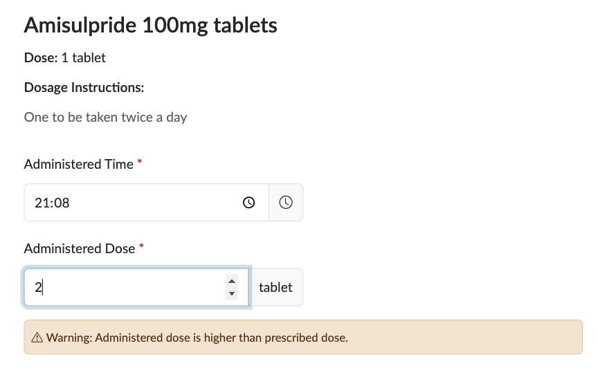 If you try and administer too much or less than the specified dosage, you will be shown a warning to tell you. HxCare won't stop you administering that amount, but you will need to record a witness with another member of staff.